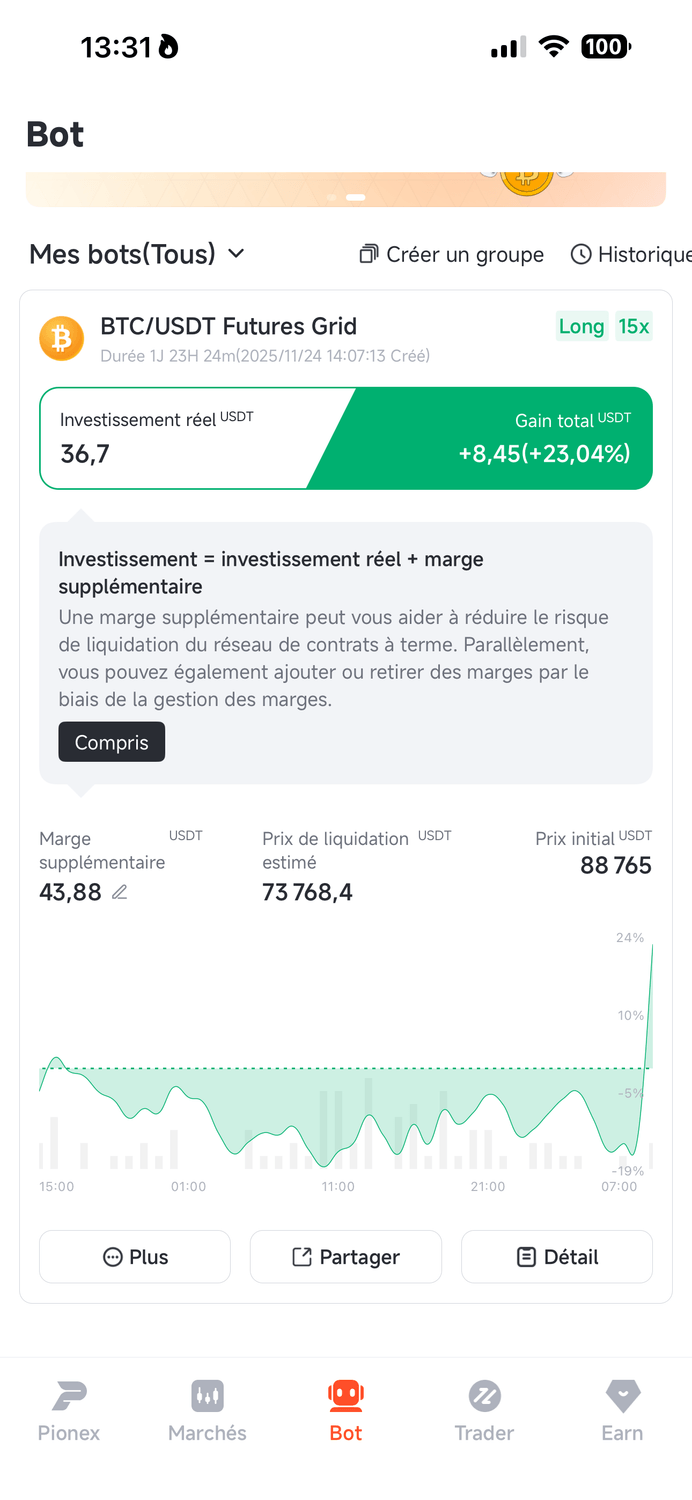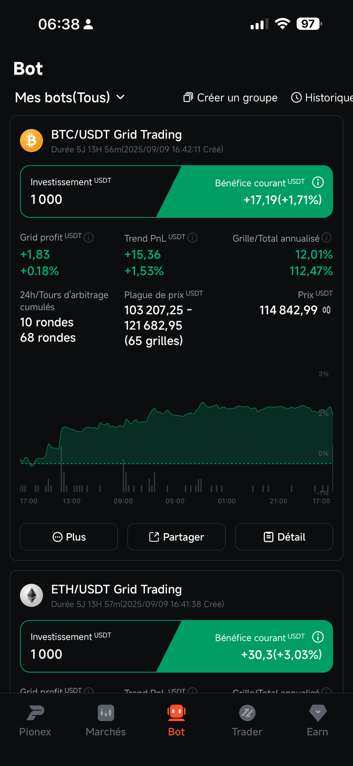 Tu choisis la paire (ex. BTC/USDT), tu mets ton budget… et le bot travaille automatiquement pour toi.l.