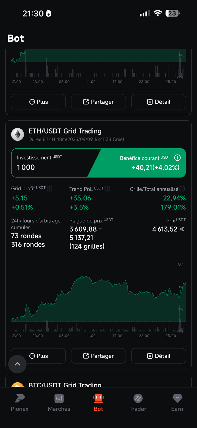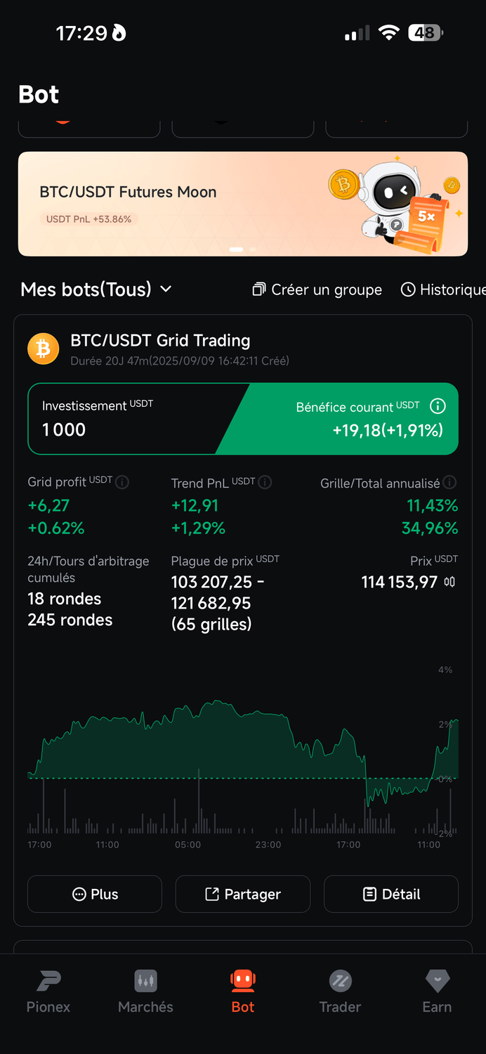 Grâce à une stratégie préprogrammée (ou fournie par l’IA de Pionex), le bot exécute automatiquement des micro-achats quand le prix baisse… et des micro-ventes quand il remonte. Pas d’émotion. Pas d’erreur humaine. Juste une mécanique qui tourne.